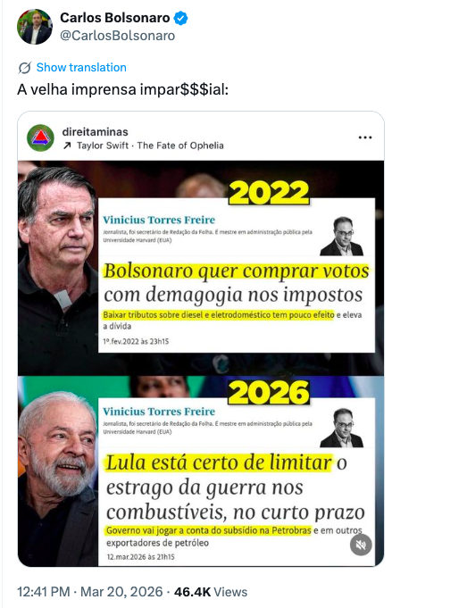 Ele resgatou uma postagem de fevereiro de 2022, que criticava a redução de impostos sobre o diesel promovida pelo governo Jair Bolsonaro como “demagogia” em ano eleitoral, e comparou com análises recentes que defendem ações semelhantes do governo Lula para mitigar o impacto da alta internacional do petróleo no diesel.