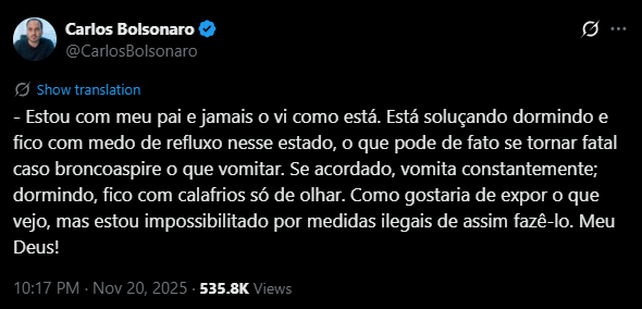 Na postagem, Carlos disse temer o agravamento do quadro de saúde do pai. O parlamentar afirmou que gostaria de mostrar a situação, mas está “impossibilitado por medidas ilegais de assim fazê-lo”.