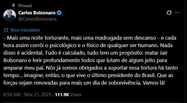 “Mais uma noite torturante, mais uma madrugada sem descanso – e cada hora assim corrói o psicológico e o físico de qualquer ser humano. Nada disso é acidental. Tudo é calculado, tudo tem um propósito: matar Jair Bolsonaro e ferir profundamente todos que lutam de algum jeito para amparar meu pai. Nós já somos obrigados a suportar essa tortura há tanto tempo… imagine, então, o que vive o último presidente do Brasil. Que as forças sejam renovadas para mais um dia de sobrevivência. Vamos lá!”