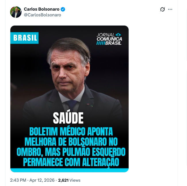 Carlos Bolsonaro (PL-RJ) divulgou atualização sobre o quadro clÃnico do presidente Jair Bolsonaro, que cumpre prisão domiciliar em BrasÃlia, confira a postagem: