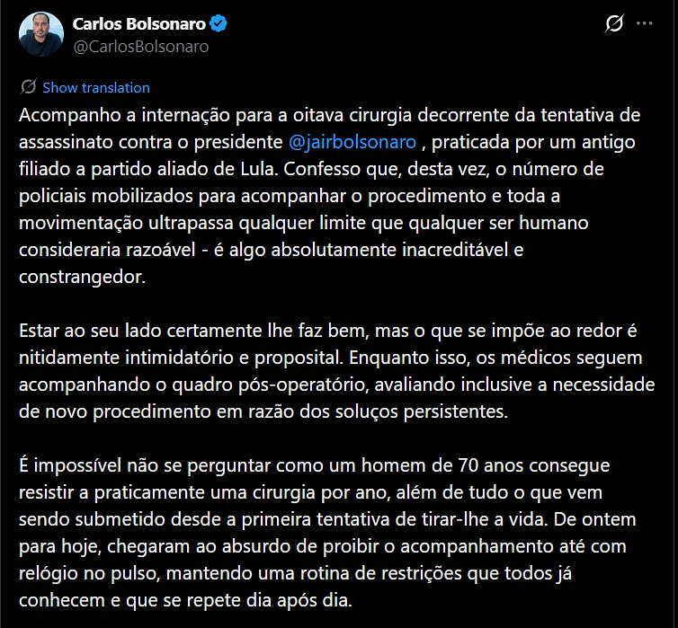 “Os médicos seguem acompanhando o quadro pós-operatório, avaliando inclusive a necessidade de novo procedimento em razão dos soluços persistentes”, escreveu Carlos na legenda da publicação.