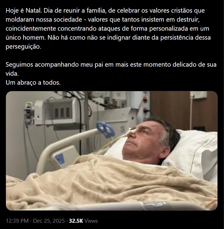 O vereador Carlos Bolsonaro publicou nesta quinta-feira (25/12) uma imagem do presidente Jair Bolsonaro (PL) durante internação hospitalar, acompanhada de atualizações sobre o quadro de saúde pós-cirúrgico. Segundo ele, a equipe médica monitora o recuperação e considera a possibilidade de uma intervenção adicional devido aos soluços recorrentes.