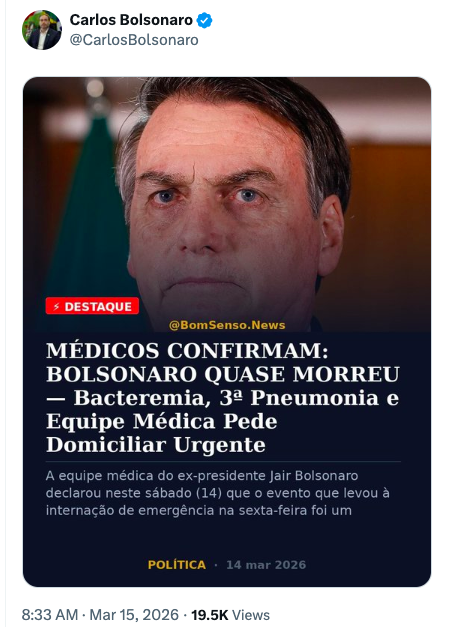 Carlos Bolsonaro publicou mensagem nas redes sociais revelando a gravidade do quadro de saúde de seu pai, o presidente Jair Bolsonaro (PL), internado no Hospital das Forças Armadas (HFA) com broncopneumonia que evoluiu para bacteremia. Segundo informações confirmadas pela equipe médica, Bolsonaro quase morreu em decorrência da infecção generalizada.