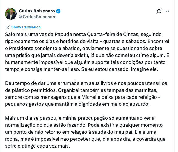 Após o encontro, Carlos publicou um relato detalhado nas redes sociais, descrevendo o estado físico e emocional do pai. Ele encontrou Bolsonaro sonolento e abatido, questionando a legitimidade da prisão.