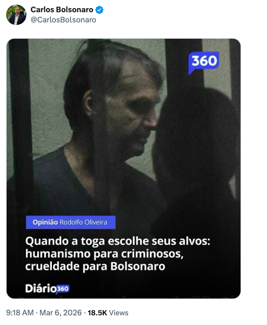 Carlos Bolsonaro publicou nas redes sociais, nesta sexta-feira (6 de março de 2026), trecho de publicação do jornal Diário 360 que critica o que chama de seletividade do Judiciário brasileiro, especialmente do Supremo Tribunal Federal (STF), no tratamento de presos políticos e condenados comuns.
