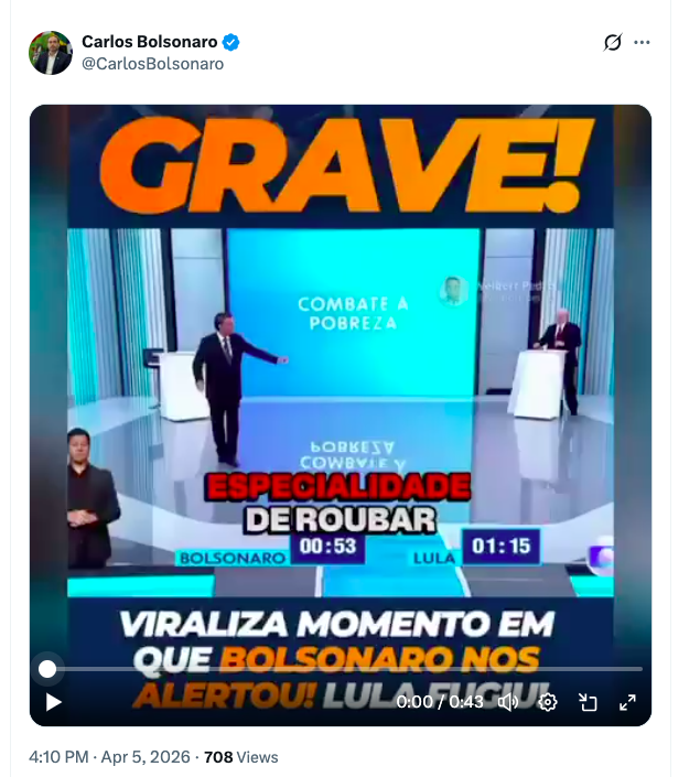 Carlos Bolsonaro (PL-RJ) publicou nas redes sociais, neste domingo (5 de abril de 2026), um vídeo antigo do presidente Jair Bolsonaro no qual ele alerta para o roubo dos aposentados do INSS, confira a postagem: