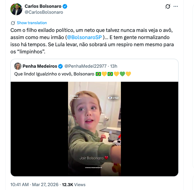“Com o filho exilado político, um neto que talvez nunca mais veja o avô, assim como meu irmão Eduardo Bolsonaro. E tem gente normalizando isso há tempos. Se Lula levar, não sobrará um respiro nem mesmo para os ‘limpinhos’”, afirmou Carlos Bolsonaro.