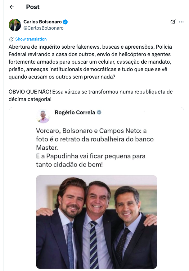 A reação veio após um deputado federal do PT publicar — e depois apagar — uma imagem gerada por inteligência artificial que colocava o presidente Jair Bolsonaro (PL), o empresário Daniel Vorcaro (dono do Banco Master) e o ex-presidente do Banco Central Roberto Campos Neto juntos, sugerindo uma suposta ligação no escândalo do banco.