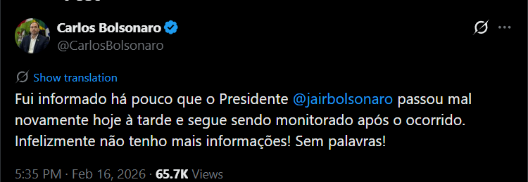 “Fui informado há pouco que o [ex-]presidente Jair Bolsonaro passou mal novamente hoje à tarde e segue sendo monitorado após o ocorrido. Infelizmente não tenho mais informações! Sem palavras!”, disse Carlos.