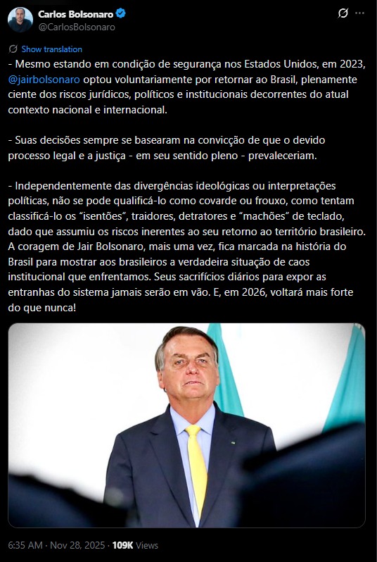 No texto, Carlos rebate duramente quem chama o pai de “covarde” ou “frouxo”, classificando os críticos como “isentões”, “traidores” e “machões de teclado”. Ele argumenta que Jair Bolsonaro correu riscos reais ao retornar ao país e enfrentar os processos, o que, segundo o filho, expõe o grave “caos institucional” vivido pelo Brasil.