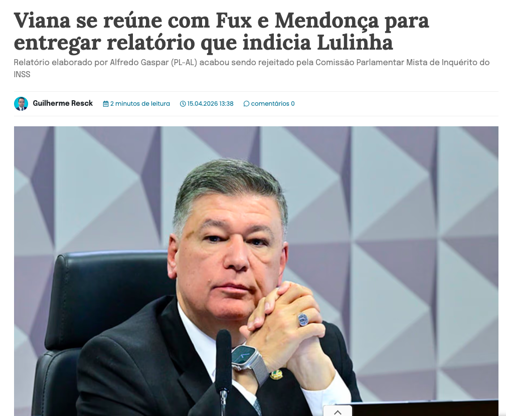 O senador Carlos Viana (PSD-MG) se reuniu nesta quarta-feira (15 de abril de 2026) com os ministros Luiz Fux e André Mendonça, do Supremo Tribunal Federal (STF), para entregar oficialmente o relatório final da CPMI do INSS. O documento, elaborado pelo deputado Alfredo Gaspar (PL-AL), pede o indiciamento de mais de 200 pessoas, incluindo Fábio Luís Lula da Silva, conhecido como Lulinha, filho do petista Lula da Silva (PT).