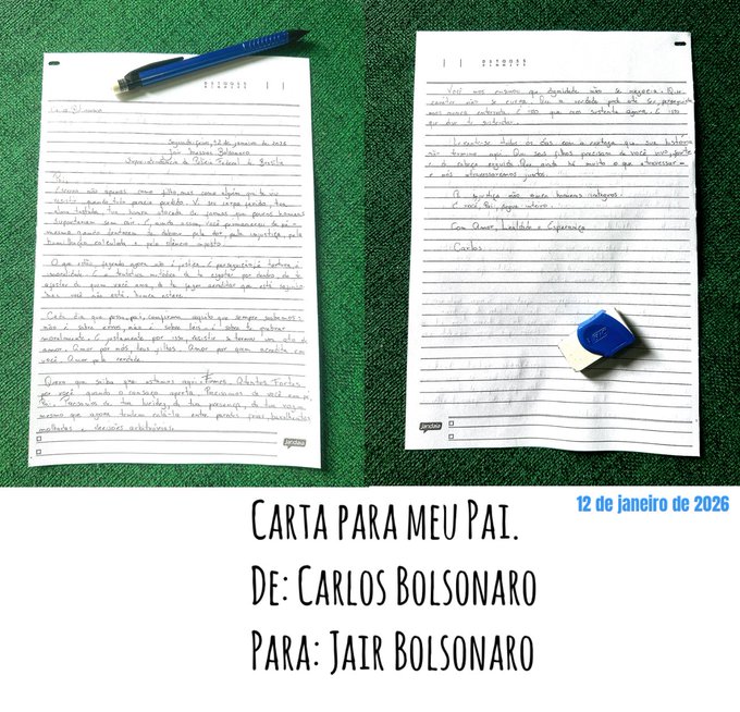 A carta completa, datada de 12 de janeiro de 2026 e endereçada diretamente a Jair Messias Bolsonaro, reforça temas de resistência, dignidade e união familiar. Nela, Carlos descreve a prisão como perseguição e tortura, e encoraja o pai a manter-se firme: “Levante-se todos os dias com a certeza de que sua história não termina aqui.”