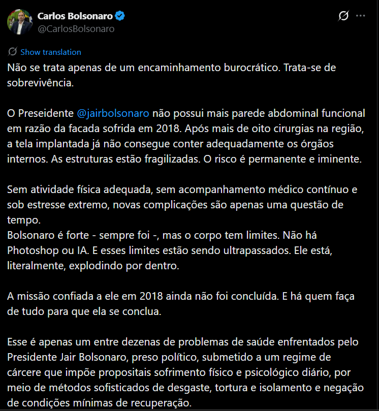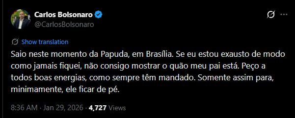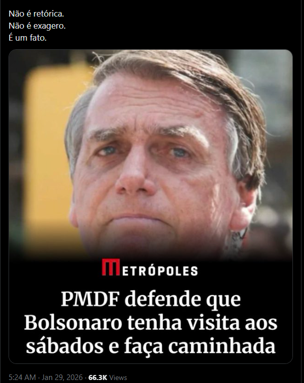Home / Política / Carlos visita Bolsonaro e revela estado de sáude do pai. PMDF defende visita aos sábados e que Bolsonaro faça caminhadaPolíticaCarlos visita Bolsonaro e revela estado de sáude do pai. PMDF defende visita aos sábados e que Bolsonaro faça caminhadaPor Editorial Nenhum comentário1 Mins ReadAtualizado: janeiro 29, 2026 11:22 am Pré-candidato ao senado em Santa Catarina, Carlos Bolsonaro seu pai, Jair Bolsonaro nesta quinta 29/01 e relatou o encontro, confira: CompartilharMarcado:BOLSONAROcarlosvisitaPrevious ArticleINTERFERÊNCIA? Moraes nega pedido para Valdemar visitar BolsonaroNext ArticleCPMI do INSS convoca Daniel Vorcaro para deporEditorialSign Up For Daily NewsletterStay updated with our weekly newsletter. Subscribe now to never miss an update! I have read and agree to the terms & conditions Leave this field empty if you're human: Related Posts Relator afirma que PL da Dosimetria incluirá Bolsonaro setembro 24, 2025 INJUSTIÇA: Por unanimidade, 1ª Turma do STF mantém Bolsonaro pres ... novembro 25, 2025 Eduardo revela que nova ordem de Trump pode proteger Bolsonaro setembro 17, 2025 PERSEGUIÇÃO: Escritórios do X em Paris são alvo de buscas; Musk é ... fevereiro 3, 2026 Controlador do Grupo Alliança enfrenta críticas por atrasos no pa ... janeiro 31, 2026 Contradições sobre reunião do BC com Vorcaro dezembro 31, 2025 Moraes assume presidência interina do STF janeiro 12, 2026 Oposição no DF solicita investigação e impeachment de Ibaneis Roc ... fevereiro 1, 2026 Nicarágua liberta presos políticos após pressão de Trump janeiro 10, 2026 Deixe um Comentário Cancelar respostaO seu endereço de e-mail não será publicado. Campos obrigatórios são marcados com *ComentárioNome * E-mail * Site Salvar meus dados neste navegador para a próxima vez que eu comentar.