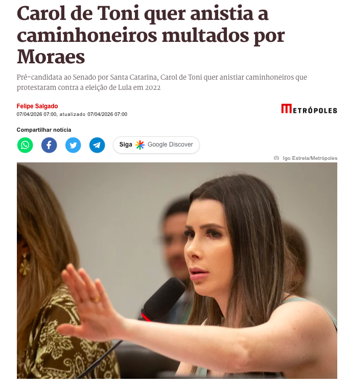 A deputada federal Caroline De Toni (PL-SC), pré-candidata ao Senado por Santa Catarina, protocolou um projeto de lei que prevê anistia a caminhoneiros e motoristas que foram multados após os protestos contra a eleição de Lula em 2022, de acordo com a matéria do Metrópoles.