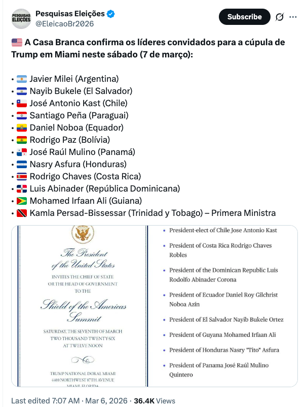 A Casa Branca divulgou nesta sexta-feira (6 de março de 2026) a lista oficial dos líderes latino-americanos convidados para a cúpula de Donald Trump em Miami, marcada para este sábado (7 de março).