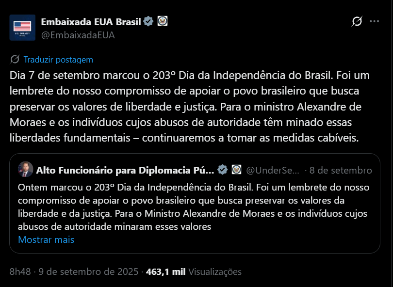 Embaixada daos EUA no Brasil reposta mensagem do Departamento de Estados dos EUA sobre as manifestações do 7 de Setmebro no Brasil e mais um ALERTA para Alexandre de Moraes.. Confira abaixo: