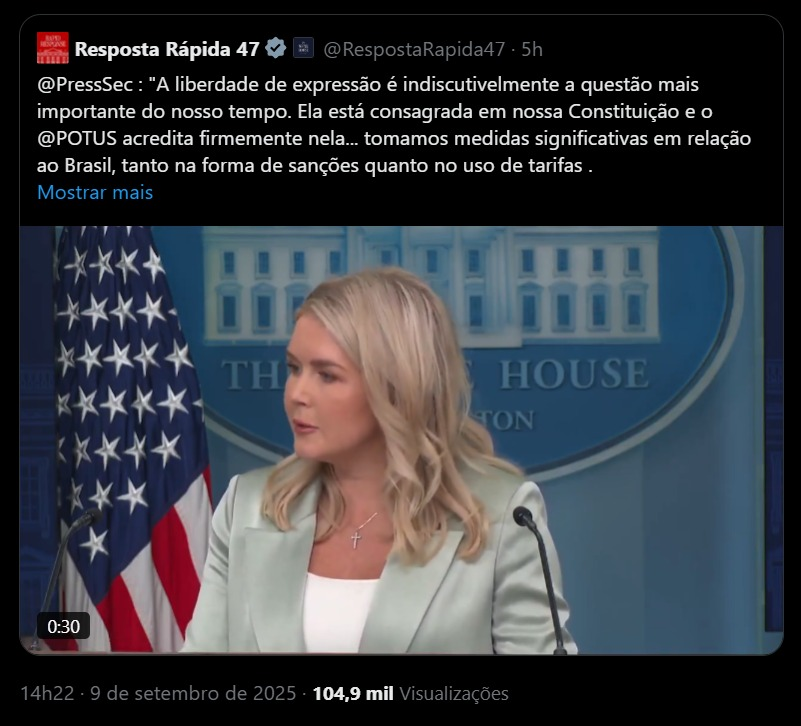 “A liberdade de expressão é, sem dúvida, a questão mais crucial da atualidade. Ela está garantida em nossa Constituição, e o presidente acredita firmemente nela”, disse Leavitt.