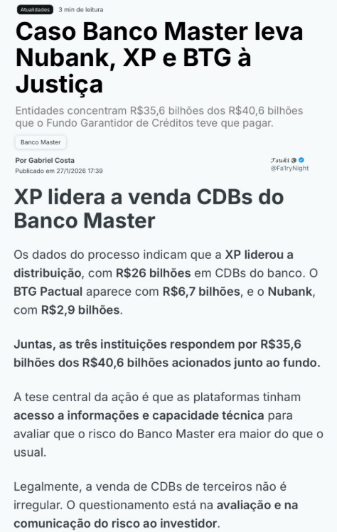 Agora, o caso do Banco Master se estendeu a grandes players do setor financeiro. A Justiça do Rio de Janeiro incluiu Nubank, XP Investimentos e BTG Pactual como rés em uma ação civil pública que investiga a maneira como os CDBs emitidos pelo Master foram oferecidos aos investidores.