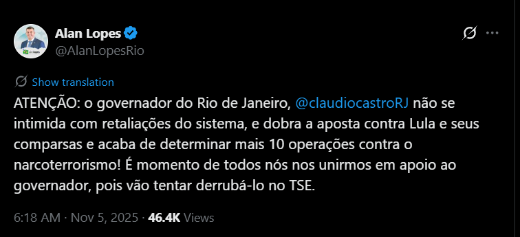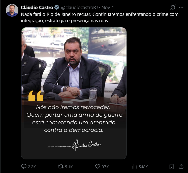“Nada fará o Rio de Janeiro recuar. Continuaremos enfrentando o crime com integração, estratégia e presença nas ruas.” escreveu Castro nas redes sociais