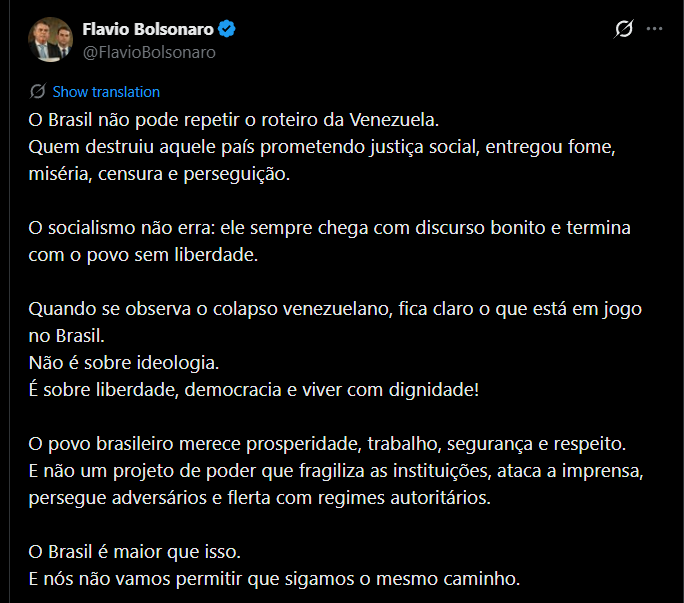 Na representação, a parlamentar acusa Flávio Bolsonaro de possível prática de crimes contra a honra de Lula, destacando especialmente uma publicação em que o senador afirmou que Lula seria “delatado” — o que, segundo ele, levaria ao “fim do Foro de São Paulo”.