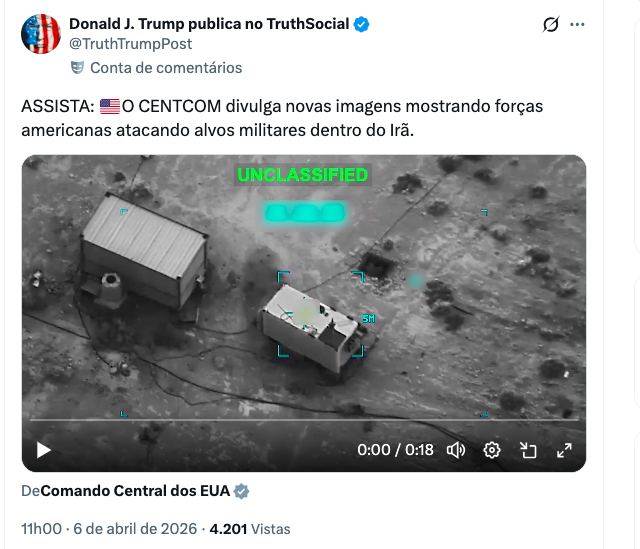 Em publicação oficial, o CENTCOM afirmou que “as forças dos EUA continuam a degradar as capacidades de combate iranianas ao atacar alvos militares no interior do Irã”. As gravações fazem parte da Operation Epic Fury, operação em andamento que já completou mais de cinco semanas de ações contra o Irã.
