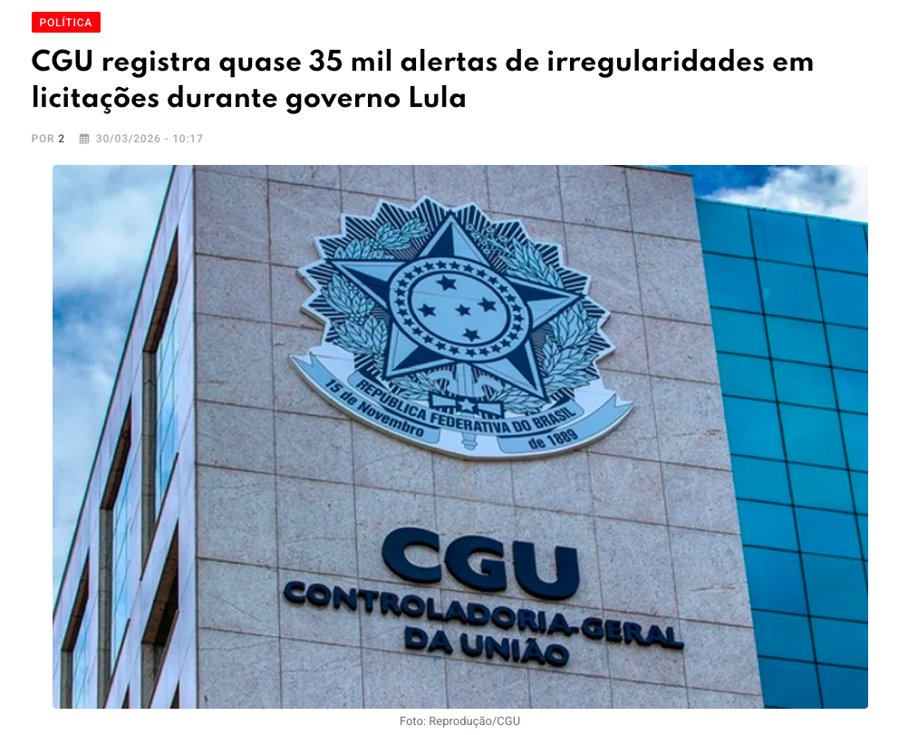 A Controladoria-Geral da União (CGU) identificou 34.733 alertas de indícios de irregularidades em editais e processos licitatórios da administração pública federal no período de 1º de janeiro de 2023 a 5 de fevereiro de 2026, que corresponde ao atual governo Lula. Os alertas foram produzidos por sistemas preditivos de análise de dados e inteligência artificial, mas todos dependem de verificação caso a caso pelas equipes de auditoria do órgão.