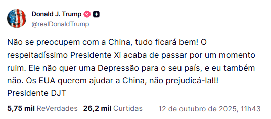 Dois dias depois de anunciar o aumento das tarifas aos produtos chineses em mais 100% a partir do dia primeiro de novembro, o presidente americano Donald Trump voltou a publicar, em sua rede social