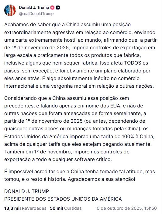 Após o comunicado da China em 9 de outubro de 2025, que ampliou as limitações de exportação de terras raras — adicionando cinco novos elementos (hólmio, érbio, túlio, európio e itérbio) à lista de controles, além de exigir licenças para tecnologias de processamento e uso em setores como defesa e semicondutores —, Donald Trump reagiu de forma acertiva e imediata, escalando as tensões comerciais.