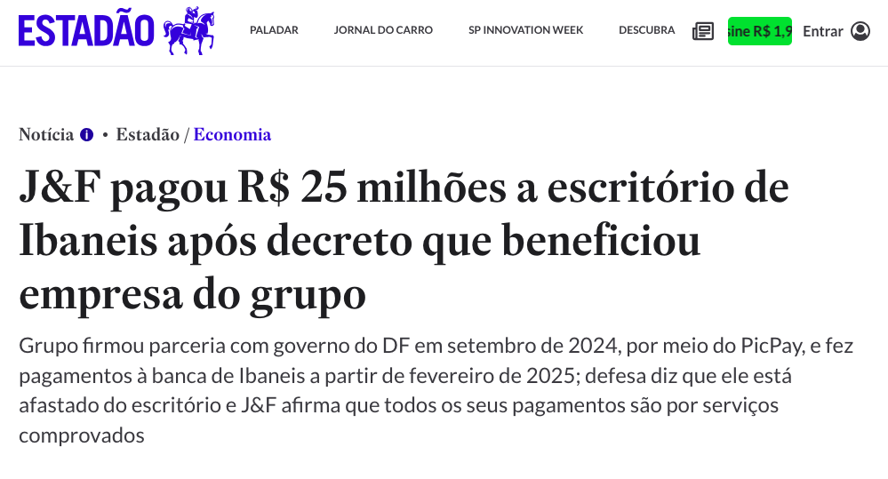 Documentos do Conselho de Controle de Atividades Financeiras (Coaf) revelaram transações consideradas “atípicas” no valor de R$ 25 milhões (exatos R$ 25.057.735,00) enviados pela J&F, holding dos irmãos Joesley e Wesley Batista, ao escritório de advocacia do governador do Distrito Federal, Ibaneis Rocha (MDB).