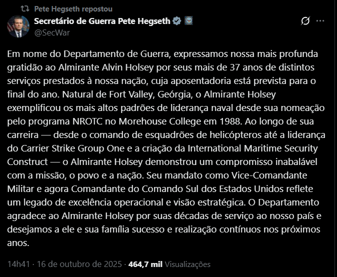 “Foi uma honra servir à nossa nação, ao povo americano e apoiar e defender a Constituição por mais de 37 anos. A partir de 12 de dezembro de 2025, me aposentarei da U.S. Navy. Servir como seu COMMANDER e deputy nos últimos 34 meses foi uma tremenda honra. A equipe SOUTHCOM tem feito contribuições duradouras para a defesa de nossa nação e estou confiante de que vocês continuarão a avançar, focados em sua missão que fortalece nossa nação e garante sua longevidade como um farol de liberdade ao redor do globo. Stephanie e eu estendemos nossa mais profunda gratidão e apreço pela oportunidade de ter servido ao lado dos mais finos guerreiros de nossa nação.Continuem avançando!!”