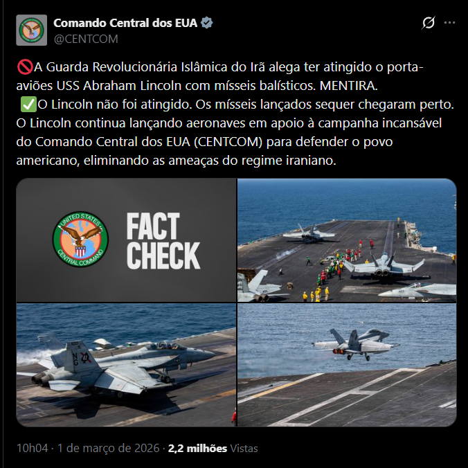 O CENTCON também desmitiu mais uma vez o Irã, sobre supostos ataques ao porta-aviões USS ABRAHAM LINCOLN.