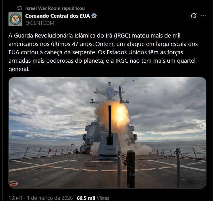 “A Guarda Revolucionária Islâmica do Irã (IRGC) matou mais de mil americanos nos últimos 47 anos. Ontem, um ataque em larga escala dos EUA cortou a cabeça da serpente. Os Estados Unidos têm as forças armadas mais poderosas do planeta, e a IRGC não tem mais um quartel-general.”