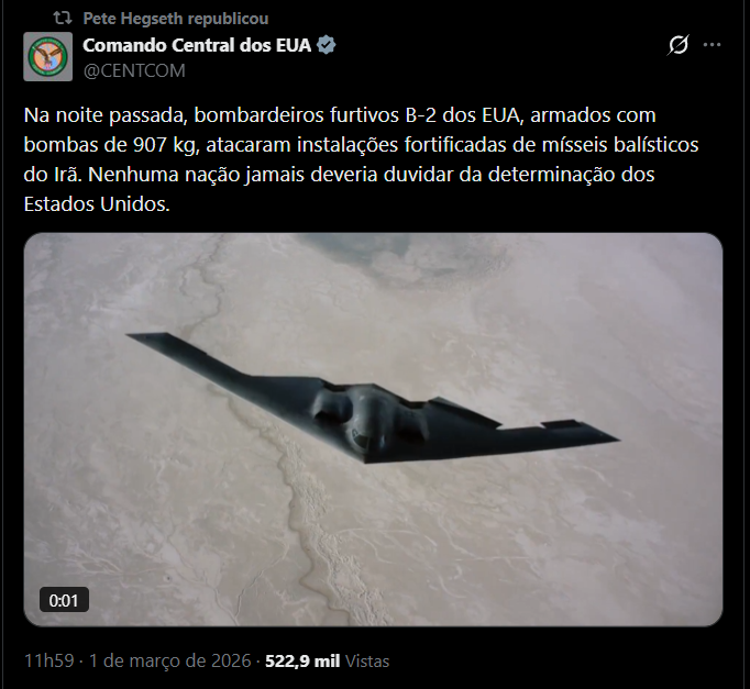 “Na noite passada, bombardeiros furtivos B-2 dos EUA, armados com bombas de 907 kg, atacaram instalações fortificadas de mísseis balísticos do Irã. Nenhuma nação jamais deveria duvidar da determinação dos Estados Unidos.”