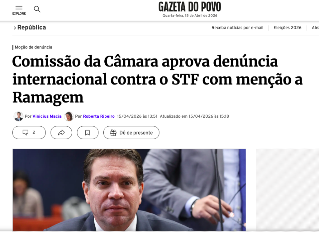 A Comissão de Relações Exteriores e de Defesa Nacional (Credn) da Câmara dos Deputados aprovou, nesta quarta-feira (15 de abril de 2026), uma moção que pede o monitoramento de atos do Supremo Tribunal Federal (STF) por organismos internacionais de direitos humanos. O texto aponta “graves violações a princípios fundamentais do Estado Democrático de Direito”, de acordo com a matéria da Gazeta do Povo.