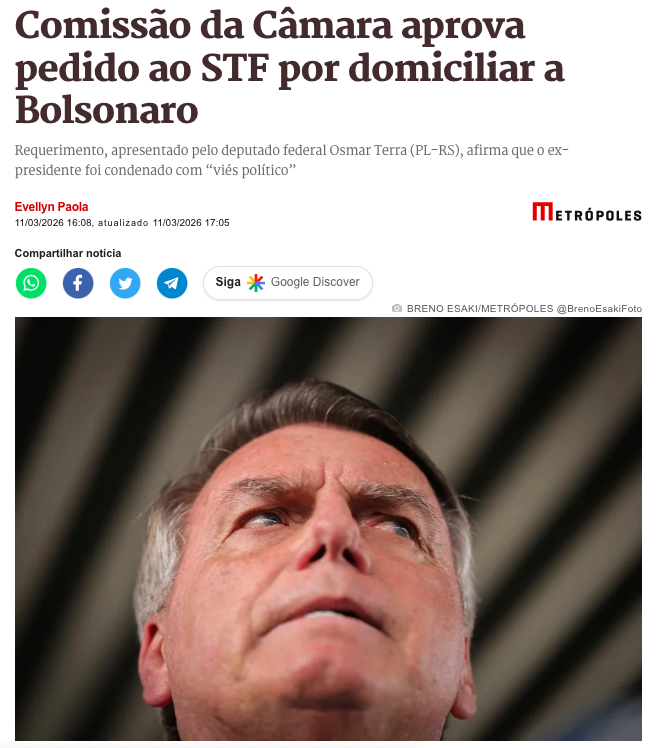 A Comissão de Segurança Pública e Combate ao Crime Organizado da Câmara dos Deputados aprovou, nesta terça-feira (10), um requerimento que solicita ao Supremo Tribunal Federal (STF) a análise da saúde do ex-presidente Jair Bolsonaro (PL) e a consideração de sua transferência para prisão domiciliar. O texto foi apresentado pelo deputado federal Osmar Terra (PL-RS), médico de formação, que expressa preocupação com o estado clínico do condenado, de acordo com a matéria do Metrópoles.