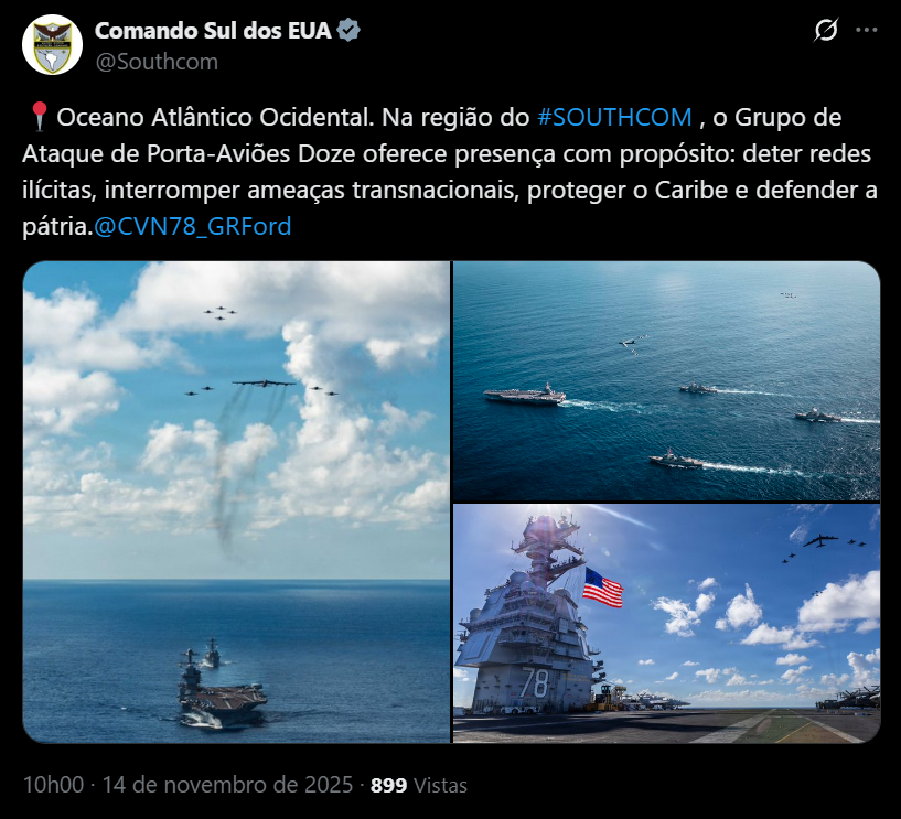 Nosso primeiro vislumbre do USS Gerald R. Ford (CVN-78) e seu Grupo de Ataque de Porta-Aviões, composto pelos destróieres de mísseis guiados da classe Arleigh Burke: USS Mahan (DDG-72), USS Winston S. Churchill (DDG-81) e USS Bainbridge (DDG-96), desde que entraram na Área de Responsabilidade do Comando Sul dos EUA na terça-feira. A Marinha dos EUA publicou fotos tiradas EM 13 de novembro de 2025, mostrando todos os navios do Grupo de Ataque de Porta-Aviões Gerald R. Ford navegando em formação pelo Atlântico Norte, enquanto caças F/A-18E/F Super Hornets, pertencentes à Ala Aérea Embarcada Oito (CVW-8), estavam presentes. incluindo aeronaves do Esquadrão de Caça de Ataque 31 (VFA-31), Esquadrão de Caça de Ataque 37 (VFA-37), Esquadrão de Caça de Ataque 87 (VFA-87) e Esquadrão de Caça de Ataque 213 (VFA-213), voaram como uma força conjunta multidomínio com um bombardeiro estratégico de longo alcance B-52H “Stratofortress” da Força Aérea dos EUA.