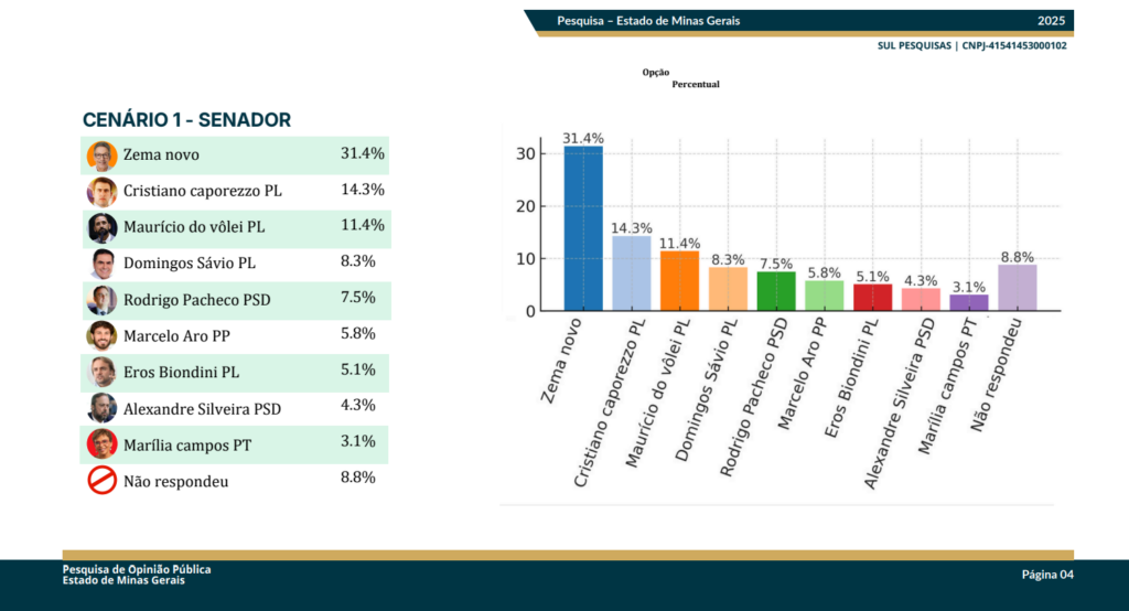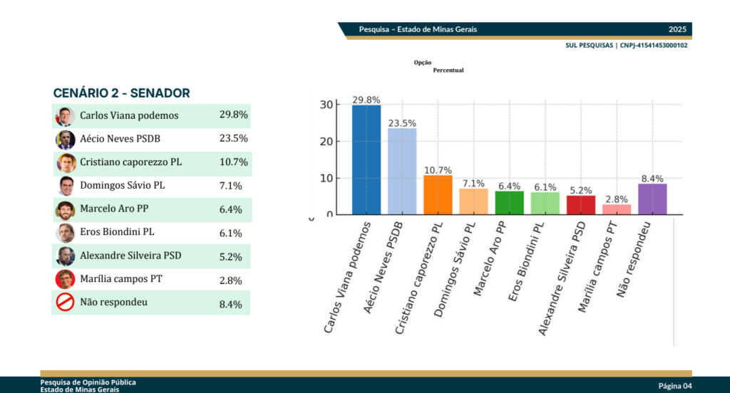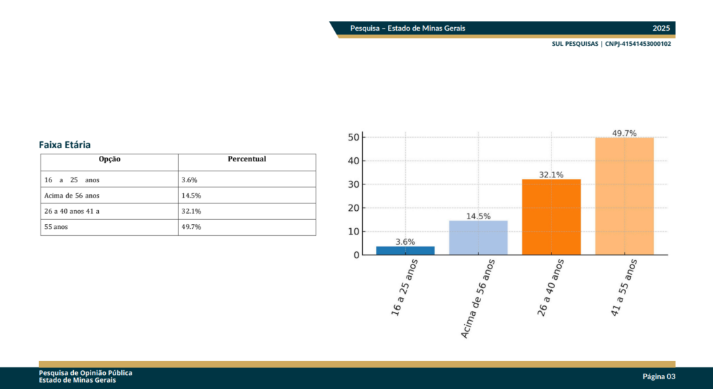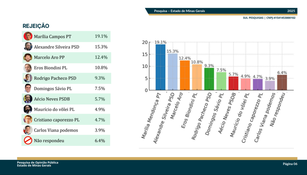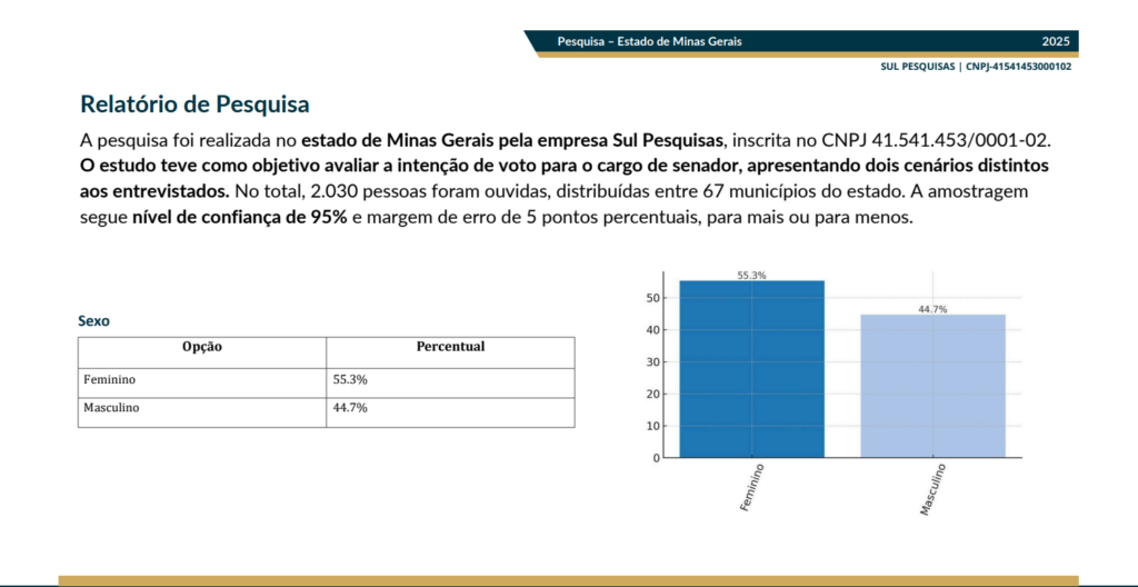Confira a pesquisa realizada no estado de Minas Gerais pela empresa Sul Pesquisas, inscrita no CNPJ 41.541.453/0001-02.