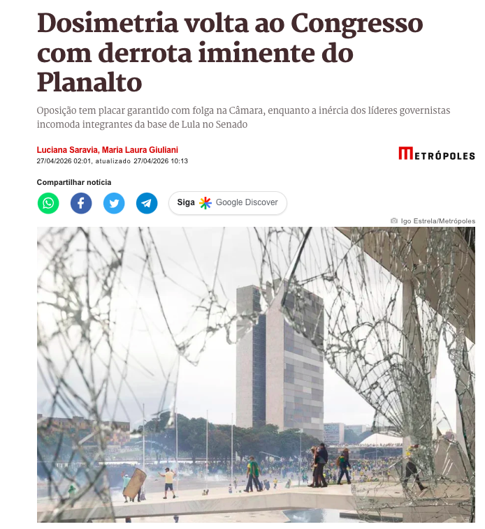 A dosimetria das penas para condenados pelos atos de 8 de janeiro de 2023 volta à pauta do Congresso Nacional nesta quinta-feira (30 de abril de 2026), em sessão conjunta da Câmara e do Senado. A expectativa é de uma derrota iminente para o governo Lula, que vetou integralmente o Projeto de Lei da Dosimetria no início do ano.
