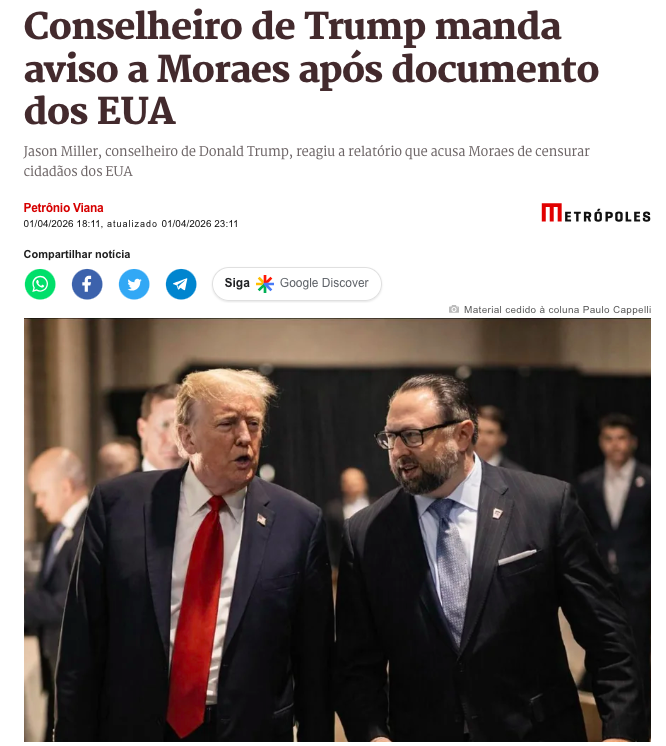 Jason Miller,conselheiro próximo do presidente Donald Trump enviou um recado direto ao ministro do Supremo Tribunal Federal (STF), Alexandre de Moraes, após a divulgação de um relatório oficial do Congresso dos Estados Unidos, de acordo com a matéria do Metrópoles.