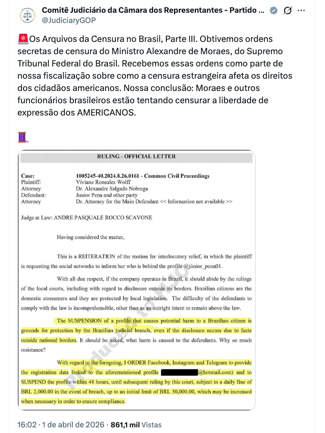 O relatório, revelado pela coluna de Andreza Matais no Metrópoles, detalha ordens secretas emitidas por Moraes para suspender perfis em redes sociais. Segundo o texto do comitê: “Obtivemos ordens secretas de censura do ministro Alexandre de Moraes, do Supremo Tribunal Federal do Brasil. Recebemos essas ordens como parte de nossa fiscalização sobre como a censura estrangeira afeta os direitos dos cidadãos americanos.”