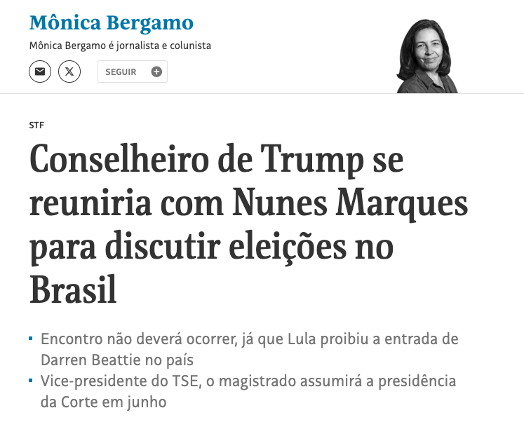 Até o momento, nem o gabinete de Kassio Nunes Marques nem o Departamento de Estado dos EUA confirmaram oficialmente o encontro.