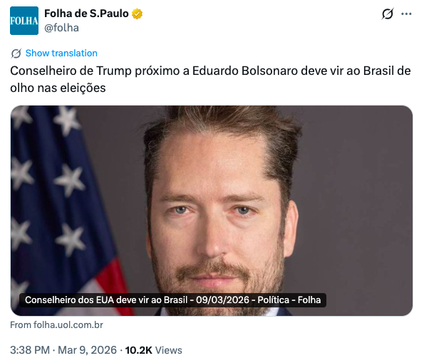 O conselheiro Darren Beattie, figura influente no círculo próximo de Donald Trump e com laços estreitos com Eduardo Bolsonaro, prepara-se para viajar ao Brasil com o objetivo declarado de acompanhar de perto o processo eleitoral de 2026.