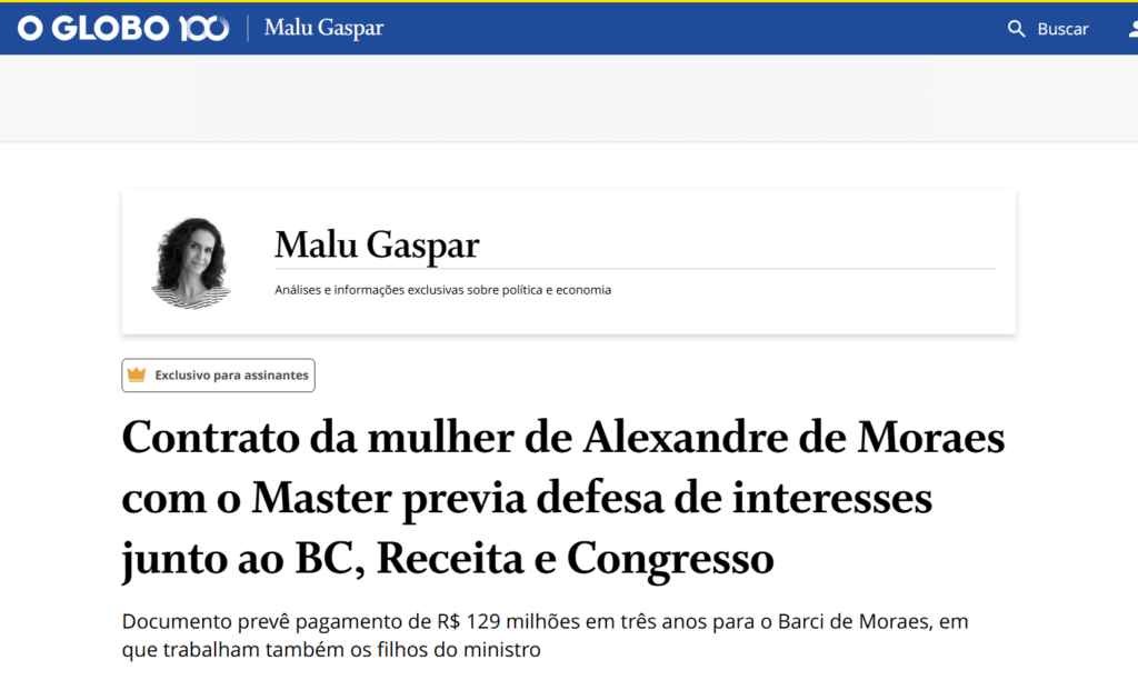 Contrato da mulher de Moraes com o Master previa defesa junto ao BC, Receita e Congresso