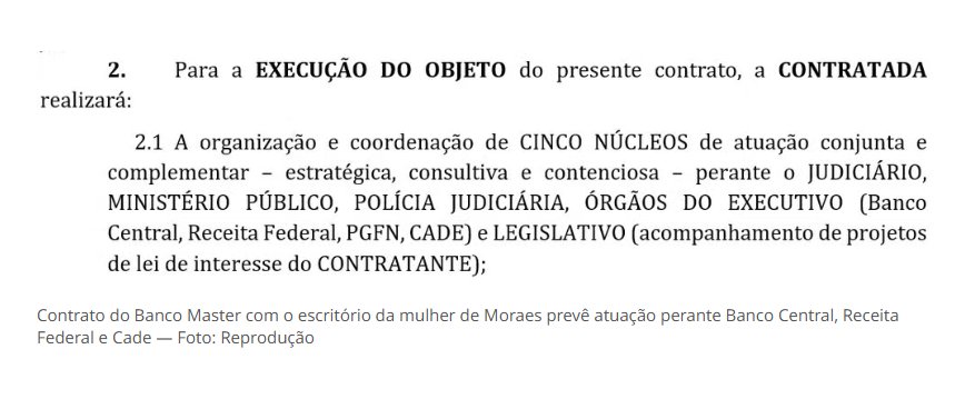 O contrato do Banco Master com a mulher do ministro Alexandre de Moraes, Viviane Barci de Moraes, previa que o escritório da família trabalhasse na defesa dos interesses da instituição e de Daniel Vorcaro junto ao Banco Central, à Receita Federal e ao Congresso Nacional.