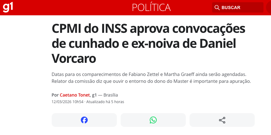 A Comissão Parlamentar Mista de Inquérito (CPMI) que investiga irregularidades no Instituto Nacional do Seguro Social (INSS) aprovou, nesta quinta-feira (12), a convocação de dois parentes próximos do banqueiro Daniel Vorcaro, ex-controlador do Banco Master. Os nomes aprovados foram o cunhado de Vorcaro e sua ex-namorada, que devem comparecer à comissão para prestar esclarecimentos sobre possíveis ligações com o esquema sob investigação, de acordo com a matéria do G1.