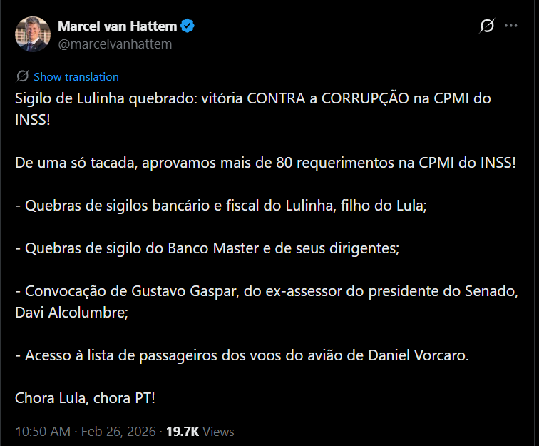 A Comissão Parlamentar Mista de Inquérito (CPMI) responsável por apurar as irregularidades e fraudes no Instituto Nacional do Seguro Social (INSS) aprovou, nesta quinta-feira (26/2), a quebra dos sigilos bancário e fiscal de Fabio Luis Lula da Silva, conhecido como Lulinha, filho do presidente Luiz Inácio Lula da Silva (PT). A medida abrange o intervalo de 1° de janeiro de 2022 a 31 de janeiro de 2026.