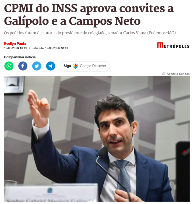 A CPMI do INSS aprovou, por ampla maioria, requerimentos para convidar o presidente do Banco Central, Roberto Campos Neto, e o diretor de Política Monetária da autarquia, Gabriel Galípolo, a prestar esclarecimentos em sessão futura, de acordo com a matéria do Metrópoles.