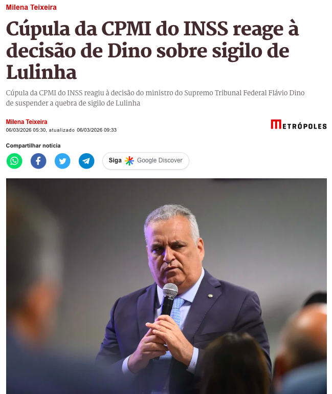 A cúpula da CPMI do INSS manifestou discordância com a liminar concedida pelo ministro Flávio Dino (STF) que suspendeu os efeitos da quebra de sigilos bancário e fiscal de Fábio Luís Lula da Silva (Lulinha), filho do presidente Lula.