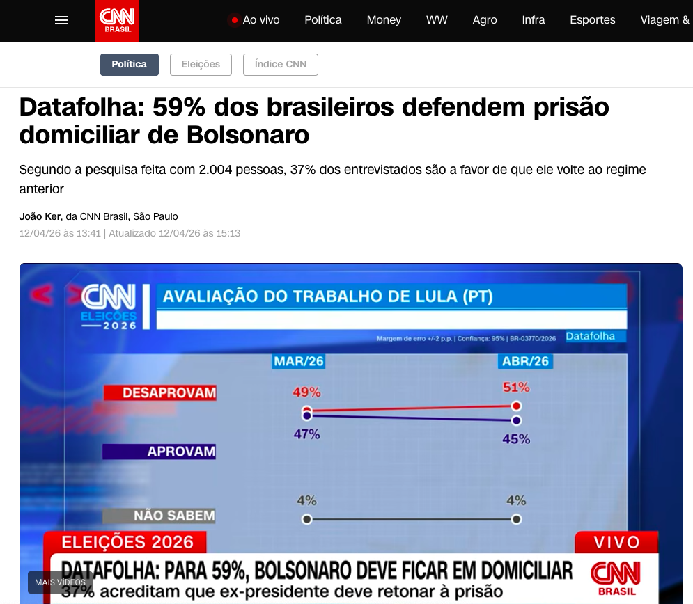 A pesquisa foi realizada entre os dias 7 e 9 de abril de 2026, com 2.004 entrevistas presenciais em 134 municÃpios. Bolsonaro cumpre domiciliar desde o dia 27 de março, após passar duas semanas internado com broncopneumonia bilateral. A medida foi autorizada pelo ministro Alexandre de Moraes, do Supremo Tribunal Federal (STF), por 90 dias.