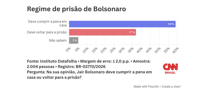 A mais recente pesquisa Datafolha mostra que a maioria da população brasileira é favorável à permanência de Jair Bolsonaro (PL) em prisão domiciliar. O levantamento indica que 59% dos entrevistados defendem que o ex-presidente continue cumprindo a pena em casa, enquanto 37% preferem que ele retorne ao regime fechado. Outros 5% não souberam ou não responderam, de acordo com a matéria da CNN BRASIL.